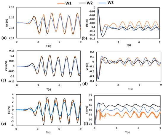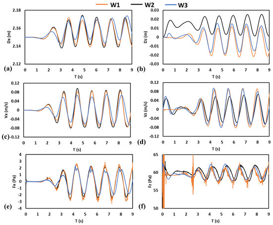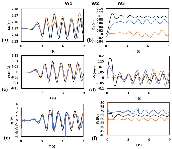 The influence of the WEC design on its movement and forces was analyzed for H = 0.04 m, k2, and ds0. Figure 6a,b display the displacement of the WECs over time in the x- and z-directions. The maximum displacement appears larger for W1 than for W2 and W3 in both the horizontal and vertical directions. The horizontal displacements for W1 and W2 are not very different, though, but the vertical movement is lower for W2. The horizontal displacement of W3 seems about twice as low as those of W1 and W2.