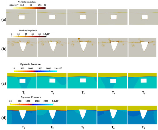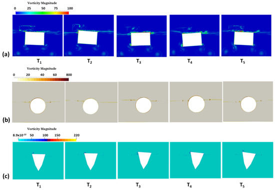 Figure 11a,b show the vorticity contours for W1 and W3. The vorticity is seen to be higher for W3 than for W1. High vorticity shedding is developed at the corners and near the tip of W3; it provides additional lift force to the WEC. Fluctuations usually occur due to both the lift and drag coefficients, but here, the fluctuations are due to a high lift coefficient.