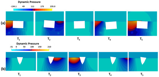Pressure contours. (a) W1. (b) W3. Wave height H = 0.04 m, submergence depth ds = 0 m, and k2 = 50 N/m.