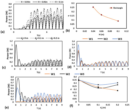 Figure 12a,b illustrate the absolute power absorbed and the efficiency for W1 for different wave heights (H) at ds0 with k2. Figure 12b shows that for W1, decreases with an increase in wave height. This is attributed to the higher value of when H increases. It can be concluded that with an increase in H, the power absorption increases. A similar observation was made by Anbarsooz et al. [16]. Figure 12c shows the absolute power absorption of W1 for the studied submergence depths. It can be noticed that the power absorption decreases with an increase in WEC depth for W1. Figure 12d,e show the effect of the WEC shape on power absorption. It can be seen from Figure 12f that the efficiency is higher for W3 than for W1 and W2 with an increase in depth, and the efficiency decreases with an increase in depth for W1. This is attributed to the power absorption, which is higher for W3 than for W1 and W2. However, as shown in Figure 12f, the efficiency of all three WECs seems to be identical at the ds0 submergence depth.
