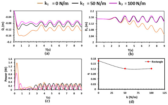 Effect of the spring constant (k) on the stability of W1 with an effective density of 1000 kg/m3, depth ds0 = 0 m, and wave height H = 0.04 m. (a,b) Vertical displacement (Dz) and horizontal displacement (Dx) of the object as a function of time. (c) Power absorption versus time for W1. (d) Efficiency versus spring constant for W1.