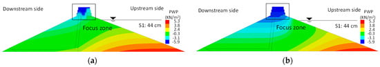 Meanwhile, the PWP at the bottom of the dam center (P2) increased rapidly during the dam crest water level (S2, 51 cm). This rapid increase might be because the saturated area formed in the upstream fill zone extended to the bottom of the center of the dam. In this experiment, the upstream water level was reached in 1 h, and there was no gradual saturation process at the bottom of the dam.