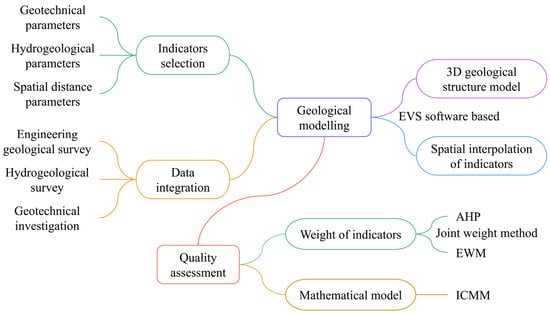 Urban underground space resource (UUSR) is deemed as the second land resource for urban development. UUSR development is significant in achieving sustainable and resilient urban development. It serves various purposes, including mitigating the shortage of land resources, easing traffic congestion, reducing carbon emissions, and revitalizing surface ecological environments [1,2,3,4,5]. However, in certain areas, the development of UUSR may lead to disasters and accidents, such as ground collapse [6], settlements [7], and tunnel water gushing [8]. UUSR is normally developed in a certain geological body subsurface. The poor geological conditions are considered to be the fundamental constraining factor of underground space [9]. Neglecting the effect of UUSR development on the geological structure, groundwater flow, and stress field will cause an irreversible and unrecoverable risk to the city. Wu et al. defined UUSR quality as the difficulty degree of UUSR development due to the influence and restriction of various geological environmental factors (GEFs) under certain technical conditions [10]. Assessing the UUSR quality based on GEFs holds paramount significance for facilitating scientific urban underground space planning and preparing for construction activities.
