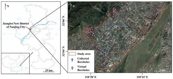 The study area is located in the Yangtze River floodplain. Engineering geological survey, hydrological geological survey, environmental geological survey and a large number of geotechnical investigations have been carried out at different stages of urban construction. The relevant reports used in this study were provided by Nanjing Center, China Geological Survey and Jiangsu Bureau of Geology and Mineral Exploration, as shown in Table 3. The study area is mainly composed of thick layered Quaternary sediments, including clay, sand and gravel, and the sandstone beneath the soils. Furthermore, complex structural features such as active faults and ground fissures are absent in this area. In order to create the 3D geological model, a collection of boreholes and virtual boreholes, which are created to accurately determine the interface between rock and soil horizontally, was integrated, as shown in Figure 3.