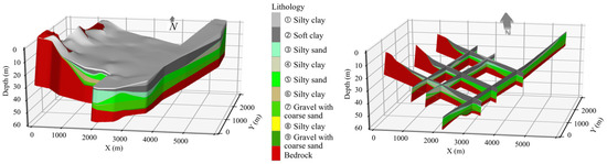 Kriging interpolation is widely used in geological and geotechnical assessments considering both the distance and degree of variation between known data points when estimating values in unknown areas [43,44]. In order to create the 3D geological model attributed with the data of geotechnical indicators c, φ, k, the geostatistical method (Kriging) is employed to interpolate geotechnical test data onto the 3D geological structure model. Considering the significant differences in engineering properties between cohesive soil and sandy soil, it is not appropriate to perform a unified interpolation of their geotechnical parameters. Therefore, for cohesive and sandy soils, the lower boundary interfaces are divided into upper and lower parts, and attribute interpolation calculations are conducted independently for each part.