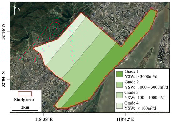 For hydrogeological indicator q, a spatially discontinuous variable parameter, is assigned by a zoning value based on the YSW, considering the spatial extent and geological constraints. The zoning value can be divided into several grades according to the specific YSW. Each node inside the 3D geological model is assigned by its zoning grade in an aquifer and 0 in an aquitard.