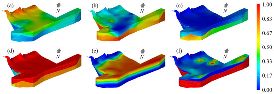 Spatial distribution of normalized indicators based on 3D geological model: (a) Normalized c; (b) Normalized φ; (c) Normalized k; (d) Normalized q; (e) Normalized dg; (f) Normalized ds.