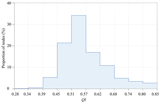 The UUSR quality assessment is carried out for the underground soils based on the calculated weights and the ICMM mathematical model. The QI value of each node inside the 3D geological model is computed, and its spatial distribution is visualized with the 3D geological model and profile grid, as shown in Figure 7. Numerical statistics of assessment results show that QI distribution ranges from 0.28 to 0.85, with a median of 0.54, as shown in Figure 8.