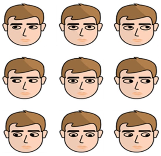 The direction of the candidate’s gaze is an important characteristic used to determine cheating. We use the candidate’s nose as the origin of the coordinate axis, and a step is defined as 45° counterclockwise. The direction of the candidate’s gaze is divided into nine categories: upleft, left, downleft, upright, right, downright, down, normal, and up. All except “normal” are labeled as abnormal gazes indicating possible cheating, as shown in Figure 3.