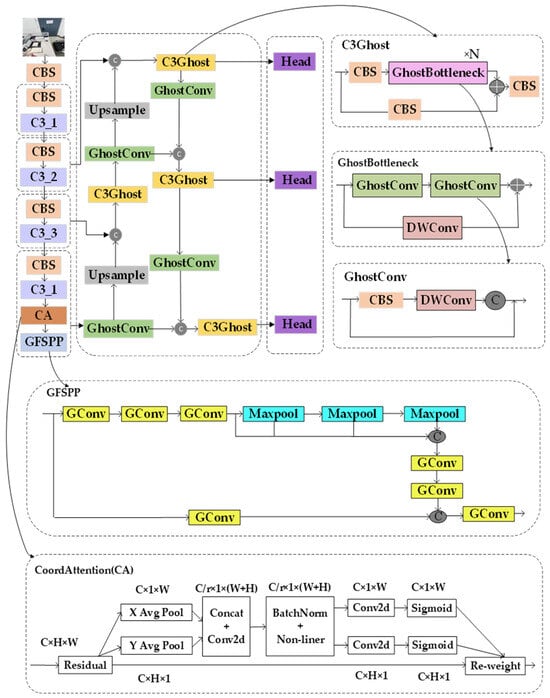 To achieve fast and accurate object detection, we propose a lightweight object detection network Lightweight-YOLOv5-Coordinate Attention (Lightweight-YOLOv5-CA) model based on Group Fast Spatial Pyramid Pooling (GFSPP). As shown in Figure 5, Coordinate Attention (CA) [38] and GFSPP are introduced successively at the end of the YOLOv5 backbone network to expand the receptive field while reducing computation and parameter volume and improving the representation ability of network features. Due to the small size and partial occlusion of the object in cheating tools such as paper and mobile phones, missed and false detection can easily occur. The CA mechanism can improve the representation ability of network features by using the importance of position information. The optimization process is as follows.