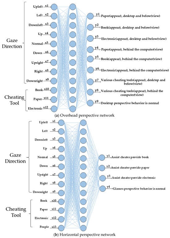 As shown in Figure 6, the above two determination models adopt a three-layer network structure of input, hidden, and output. However, there are slight differences in the numbers of the input and output neurons of the different perspective network models. There are a total of 12 input neurons in the overhead cheating behavior determination model, comprising the confidence of nine gaze directions and three cheating tools. The output consists of nine neurons, representing different cheating tools appearing at different positions on the desktop. The input neurons of the horizontal perspective cheating behavior determination model include the confidence of nine gaze directions and four cheating tools. The four output neurons represent three types of cheating situations, with the assistance of third parties and normal behavior. The output neurons of the network under the two perspectives are defined in Table 1 and Table 2, determined as shown in Figure 7a–f and Figure 8.