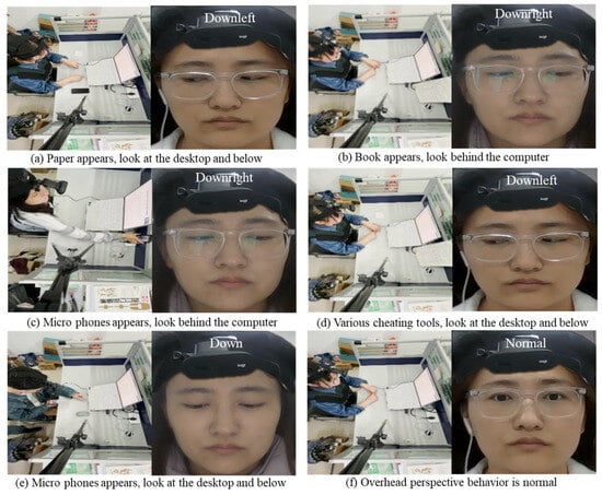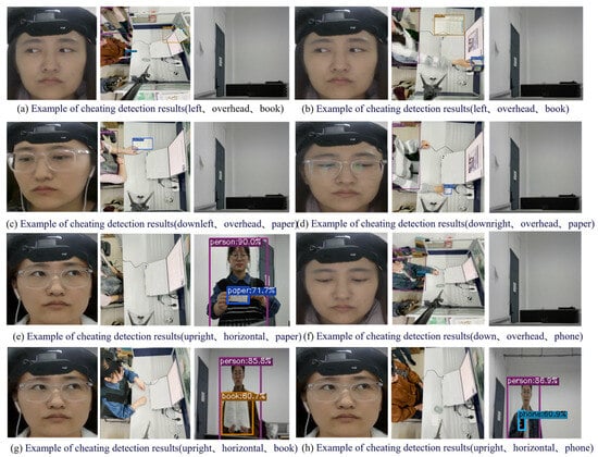 Figure 15 shows the detection results of eight common cheating behaviors. Each set of monitoring images consists of images from the perspectives of overhead, face, and horizontal. It can be seen that when the candidate’s gaze direction is left, right, downleft, downright, or down, a student is often using a tool from the desktop to cheat; when the candidate’s gaze direction is upleft, up, or upright, there is often a third party assisting in cheating. The monitoring images from the three perspectives can clearly and effectively describe the cheating behavior.