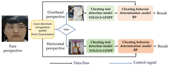 This paper is organized as follows: Section 2 provides a literature review on single-perspective and dual-perspective cheating behavior detection methods. Section 3 introduces the framework of the three-perspective adaptive examination cheating behavior detection system, which includes a gaze direction recognition model, two object detection models under overhead and horizontal perspectives, and a multimodal cheating behavior determination model based on the BP neural network. Section 4 conducts experiments and analyzes the results. Section 5 draws a research conclusion and proposes research prospects.