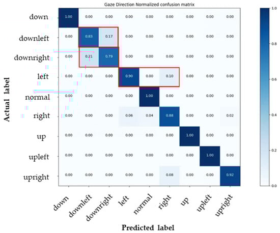 By observing the area of the confusion matrix indicated with red frames shown in Figure 13, it can be seen that 17% of the downleft direction is incorrectly identified as downright, 21% of downright is incorrectly identified as downleft, and 10% of left is incorrectly identified as right. Because downleft, downright, left, and right are abnormal gazes in the overhead perspective, some confusion between these four directions will not affect the accuracy of final cheating behavior identification.