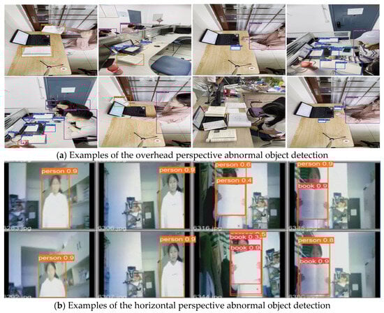 The cheating tool detection model in this paper includes a desktop perspective abnormal object detection model and a glasses perspective abnormal object detection model. The types and appearances of cheating tools vary from different perspectives. Therefore, we established an overhead perspective abnormal object dataset and a horizontal perspective abnormal object dataset. The overhead perspective abnormal object dataset includes 7600 images of books, paper, and mobile phones, as shown in Figure 11a. The horizontal perspective abnormal object dataset includes 8899 images of books, paper, mobile phones, and people, as shown in Figure 11b.