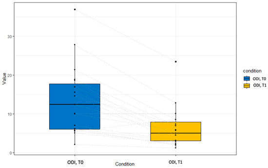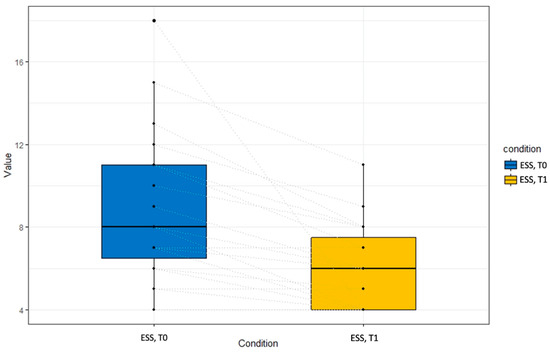 Regarding the scores obtained from the self-completion of the Epworth questionnaire, a significant decrease was observed with a p-value of 0.0006, indicating strong statistical significance (p < 0.01). However, for clinical relevance, a reduction of at least two points in the questionnaire score is required to confirm a real improvement in clinical symptoms with a reduction in daytime sleepiness [37], with a score of >10/24 indicating pathological daytime sleepiness. Specifically, in the examined sample, the majority of patients (12 out of 19) obtained a score <10 on the initial questionnaire, indicating they were not sleepy, while another 3 out of 19 did not report any difference in the score before and after the questionnaire, and the same number of patients reduced the score by only 1 point before and after treatment.