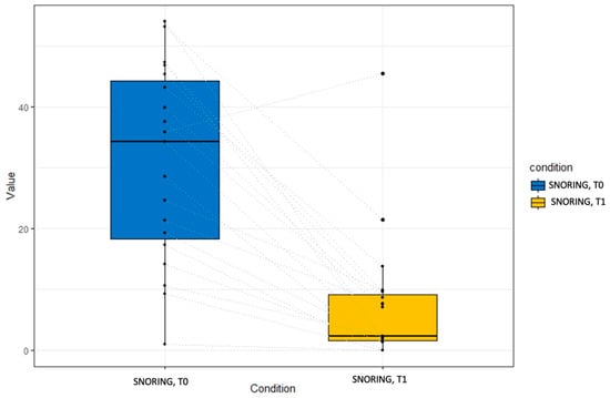 Box-plot type graph showing the values of snoring percentage before and after the application of the F22 MAD.