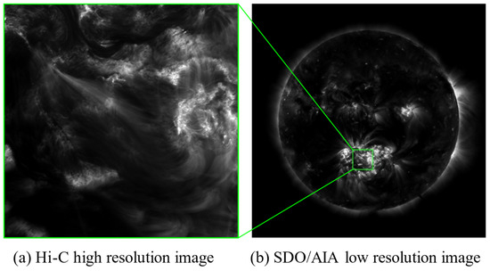 Different from the common practice in the field of super-resolution, where high-resolution (HR) images are downsampled to obtain low-resolution (LR) images, we applied deep learning mapping studies by aligning solar astronomical images captured at the same time but using different hardware facilities. This method provides LR and HR image comparisons that more closely match actual conditions, hence gathering data more suitable for real-world application scenarios, which is extremely beneficial for enhancing the generalization ability of the model. In the experiments presented in this paper, the LR images were sourced from the Atmospheric Imaging Assembly [3] (AIA) of the Solar Dynamics Observatory [4] (SDO), selecting images at two different wavelengths of 171 angstroms and 193 angstroms. These bands can effectively capture phenomena such as coronal mass ejections. The HR images are from NASA’s High-Resolution Coronal imager (Hi-C) project, which includes all 114 high-definition coronal images from both Hi-C 1 and Hi-C 2.1. Hi-C 1 captured 36 coronal images at 193 angstroms from 16:52 to 16:55 on 11 July 2012, while Hi-C 2.1 captured 78 coronal images at 172 angstroms from 16:56 to 17:01 on 29 May 2018. To expand our dataset, we performed random cropping, horizontal flipping, rotation, and translation operations, ultimately selecting 440 image pairs as the training set. The resolution of HR images is 2048 × 2048, while the resolution of LR images is 512 × 512. In addition, we selected another 80 pairs of images as the validation set and the test set, with data from Hi-C 1 and Hi-C 2.1’s two different wavebands divided in a 2:1 ratio.