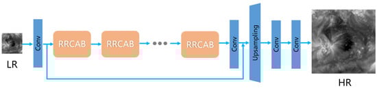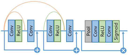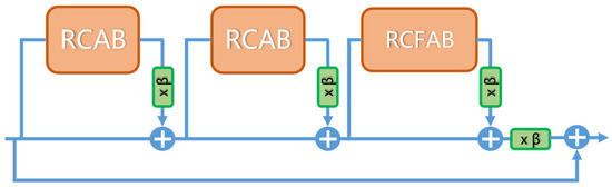 We propose a new model based on the existing one, which includes a Residual-in-Residual Concatenation Attention Block (RRCAB). As shown in Figure 4, the model structure contains two types of basic blocks: the Residual Concatenation Attention Block (RCAB) and the Residual Concatenation Fusion Attention Block (RCFAB) [21]. These two basic blocks mainly perform different feature extraction tasks, with the RCAB focusing on feature extraction among image channels, while the RCFAB emphasizes the extraction of spatial features of images and the fusion of channel and spatial features. These modules are connected in series through residual connections and introduce a scaling factor so that the network can learn the identity mapping and ensure the lossless transmission of information. Thus, even with a significant depth, the network can be trained effectively, improving the speed and accuracy of training.