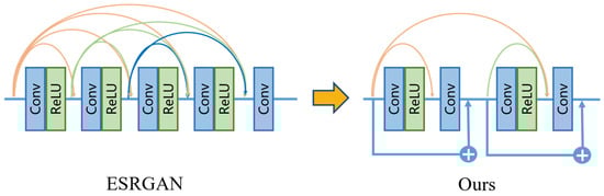 Our proposed method, compared to ESRGAN, removed some of the redundant dense connections. As shown in Figure 3, a basic block originally contained 9 connection operations. We believe that an excess of connections could potentially weaken model performance, as they might result in the preservation of insignificant features. Therefore, while retaining some of the necessary connections, we introduced residual connections. Experiments have confirmed that this improvement not only significantly reduced the number of model parameters but also enhanced model performance.