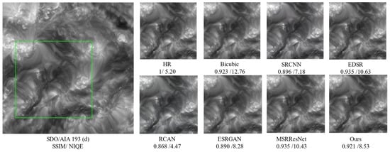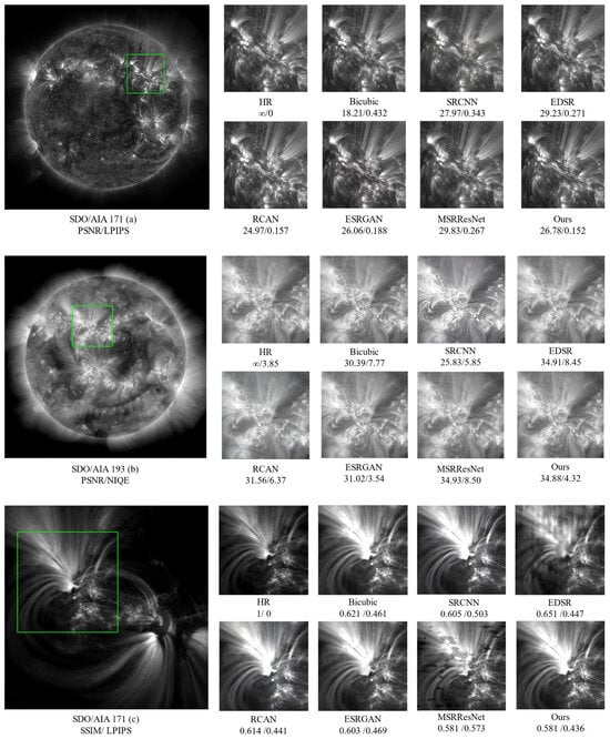 In this paper, we use four metrics to evaluate the super-resolution quality of solar images: PSNR, SSIM, NIQE [25], and LPIPS [26]. PSNR and SSIM are two metrics primarily used to quantify the similarity between super-resolution images and original images at the pixel level and structural level. NIQE and LPIPS, on the other hand, are used to measure the perceptual quality of images, reflecting their visual preference.