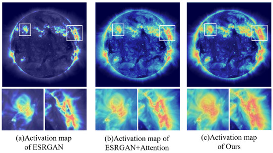 We have made critical improvements to the ESRGAN network. Firstly, an attention mechanism was introduced, which is particularly important for coronal images because it allows the model to capture coronal features more effectively. After the sixth RRCAB module in the network, we implemented feature activation visualization. Compared to the original model, our improved model demonstrates superior performance in capturing overall solar coronal features. As shown in Figure 9, the feature activation maps indicate that the introduction of the spatial attention mechanism significantly enhances feature recognition capability. Based on this, the model we propose not only further extends the range of capturing coronal features but also captures more coronal feature information that the original model failed to recognize.