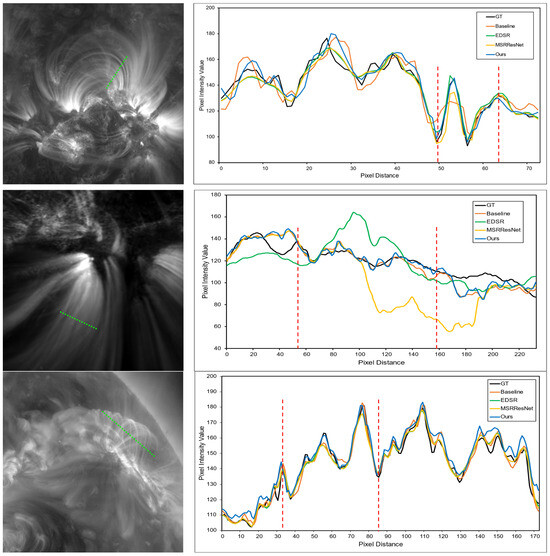 We evaluated the AIA images that had undergone super-resolution processing and achieved results surpassing other models in terms of image quality metrics. To substantiate whether our approach could more accurately approximate Hi-C images compared to other models, we designed and conducted two experimental analyses for comparison. As shown in Figure 10, the profile lines [13] taken from three solar coronal images, after being processed by our model, perform closer to the original images in terms of image pixel intensity restoration. Especially in handling the pixels where the intensity rapidly decreases and then increases in the processed images, our model demonstrates superior recovery ability.