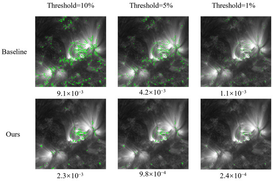 To validate the superiority of our model compared to the baseline model in restoring solar astronomical texture features, we conducted a difference comparison experiment. Specifically, we set three different thresholds to measure the acceptable differences between pixels in the super-resolved images and the original images. Pixels that exceeded this threshold were considered to have significant differences and were marked in green in the images. To make the results easier to observe, we also label the four surrounding pixel coordinates—up, down, left, and right of the discrepancy points—as green. At the same time, we calculated the percentage of green-marked pixels in the total image pixels, namely the rate of difference. Figure 11 shows the experimental results; our model has a significantly lower rate of difference compared to traditional models, with a noticeable reduction in green-marked difference points. This indicates that our model is more accurate in restoring the texture features of the solar surface compared to the baseline model, and the frequency of erroneous pixels is lower.