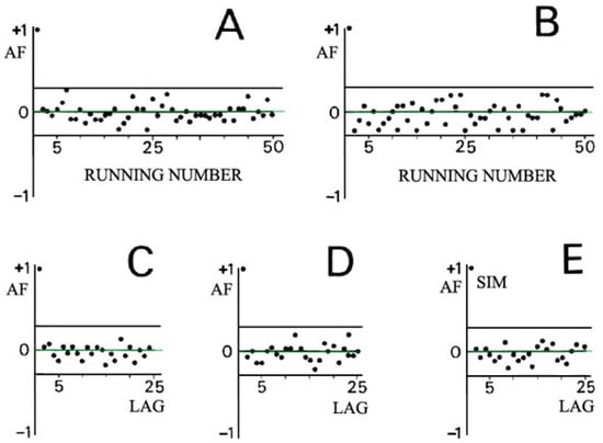 Autocorrelation function (AF) of the individual IRT values (A,B) and cumulated IRT values in time bins (C,D). The same for randomly generated IRT values (E). Notice that autocorrelation values are always inside the Bartlett bands, indicating no time dependency in the IRT series. Adapted with permission from []. 1992, Springer.