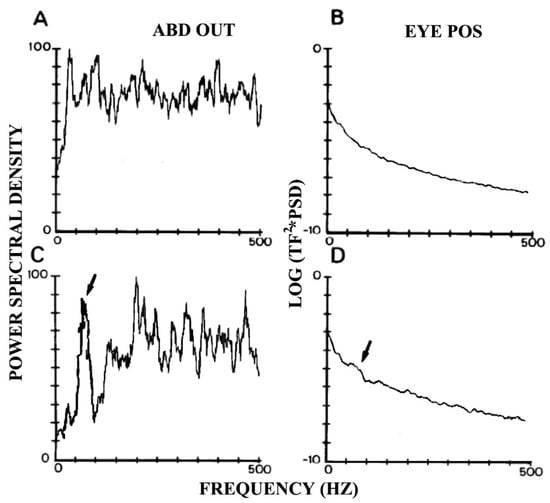 Power Spectral density. (A,C) Averaged Power Spectral Density (PSD) of 50 sequences of the simulated neural discharge of the abducens nerve (ABD OUT) for 0° (A) and 10° eye positions (C). (B,D) PSD functions of the 0° (B) and 10° eye positions (EYE POS) (D). Adapted with permission from []. 1989, Elsevier.