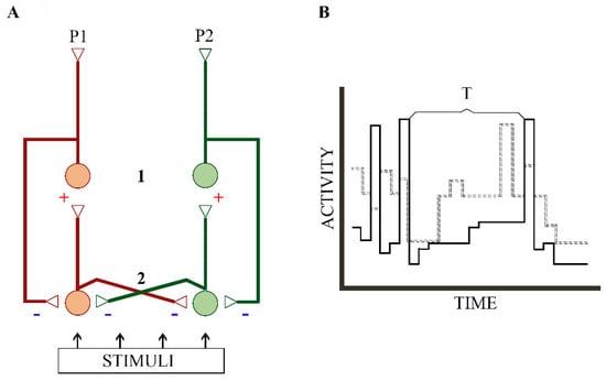 During perception of ambiguous figures such as the Necker cube, as well as the perception of incompatible images presented in each eye (eye rivalry phenomenon), the conscious perceptions of the two incompatible images alternate. It is possible, given the broad variability in the perceptual duration of the presented images, that transitions between percepts would be animated via random processes. In fact, at least two models have proposed such random influence at the organismic behavioral level. Logothetis [] proposed that perceptual duration histograms are fitted by gamma distributions and Lehky [] by a log-normal probability. Lehky [] also showed that the time series presented no autocorrelations and that this time series was not explained by a chaotic system. The demonstration of not being a chaotic system was based on the correlation dimensions and nonlinear forecasting of the time series, giving ground for a random process to govern the transitions of perceptual states. Gómez et al. [] proposed that alternation between percepts occurs as a form of competition between the neural networks representing the two percepts. Such networks should have a mutual inhibition, as depicted in Figure 4A, and each network representing an image should have a stochastic dynamic, as represented in Figure 4B.