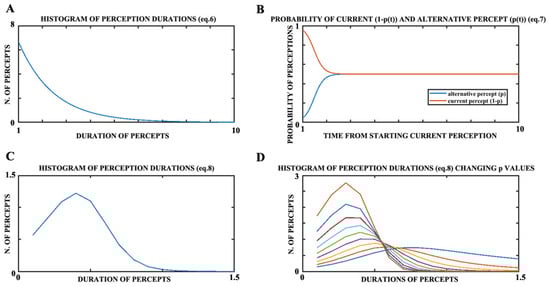 The values of (1 − p) and p can be made to be dependent on the time in which the transition occurs. This modification of the geometric distribution permitted us to increase the fitting of experimental data [] and supposes, that after a transition, there is a higher probability for the network representing the current perceived object to be defeated in the competition. Equation (7) and Figure 5B imply that the average probability that the win probability of the neural network representing the alternative percept (p) relative to the one that won the competition (1 − p) increases over time, while the probability that the current perception would be defeated in the competition increases with time. The most probable physiological mechanism would be the habituation of the neural network representing the current perception. Therefore, the probability that a percept is consciously perceptible during a certain time will be a function of the time since its perception was established (Equation (8)). Therefore, the probability of perception is now a function of time since the last change in perception in this bistable perceptual system (p(t)) (Figure 5B).