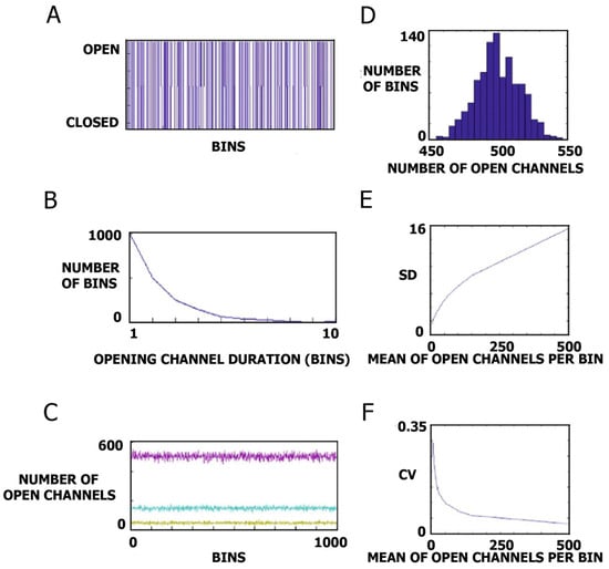 Figure 6A shows a series of simulated closings and openings of ionic channels selected from a Bernoulli random process. The frequency histogram of the opening durations of an ionic channel is displayed in Figure 6B, showing an exponential decay, as has been observed empirically []. The time series of the number of open channels are represented in Figure 6C for three different stimuli intensities. This time series presents a Gaussian distribution (Figure 6D). The increase in the number of open channels for higher stimuli intensity induced an increase in variability (Figure 6E,F).