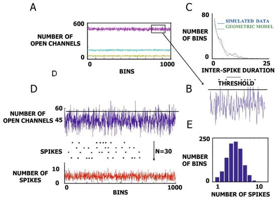 Simulation of the number of spikes in a sensory network representing a perceptual object. (A) Same as in Figure 6C. (B) The number of open channels in each time bin with a line indicating the hypothetical action potential threshold. (C) The geometric model of the frequency distribution of the inter-spike intervals. (D) On the upper side, the open channel time series, and on the middle and lower sides, the number of spikes in the sensory network that would represent the perceived object. (E) Gaussian-like distribution of the number of spike series of the lower (D). Adapted with permission from []. 2008, Springer.