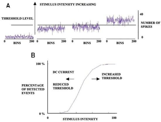 Psychometric or psychophysics function. (A) Number of spikes for the increasing intensity of the stimulation. The line shows the arbitrary threshold for stimulus detection. With stimulation intensity, the number of spikes per time bin increases and then the event detection probability also increases. (B) Psychometric or psychophysics function. The predicted displacement of the psychometric function caused by reducing or increasing the threshold for event detection or injecting a certain level of DC current is indicated by arrows. Adapted with permission from []. 2008, Springer.