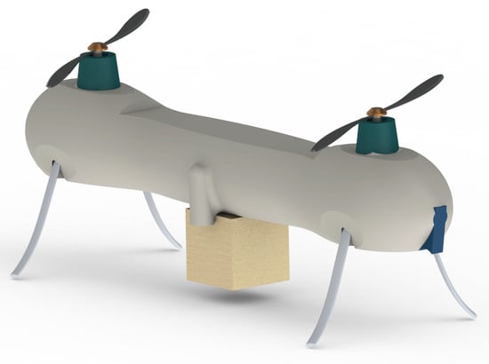 In recent years, UAVs have been widely used in logistics, surveillance and warning systems, geographic information systems, fire extinguishing, and agricultural pest control [,,]. The modeling of UAVs, with an ever-increasing scope of use, has recently been the subject of many scientific studies. The modeling enables the determination of the system reliability of UAVs and the study of their behaviour under different operating conditions. In the literature, the two-rotor balance system is also referred to as the Seesaw [,,]. The two-rotor balance system is used primarily for the analysis of multi-rotor systems and is important as the basis of UAV systems []. Therefore, two-rotor systems are used for the study of the 2R-UAV balance System. The effectiveness of the control structure used determines how well two-rotor and multi-rotor UAVs operate []. Thus, research has been conducted to enhance the two-rotor system’s balance control. An example of a 2R-UAV for load carrying operations is given in Figure 1.