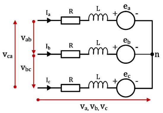 Figure 2 shows the equivalent electrical circuit of the BLDCM. Three-phase electricity is used to power this equivalent circuit. Other waveforms, such as square waves, can be applied in place of a sinusoidal source, provided that the peak voltage stays within the motor’s maximum voltage limit [,].