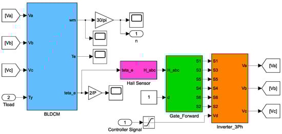 The previously provided mathematical equations were used to model BLDCM in the Simulink environment. Following that, the Simulink model of the BLDCM and its drive system depicted in Figure 3 was built by incorporating the sub-models for the inverter and switching signals that are derived based on the data received from the Hall sensors.