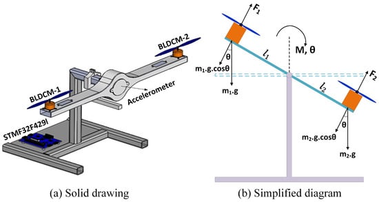 Newton’s laws can be used to express the forces acting on the system when frictions are ignored, as shown in Figure 4. When the motors receive voltage in the 2R-UAV balance system, the propellers begin to rotate, producing a torque based on the values of the resulting and forces. The dynamic equations of the equilibrium system illustrated in Figure 4 are given by Equations (18) and (19), in accordance with Newton’s laws [].