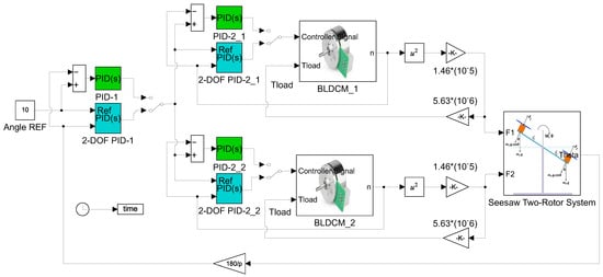 Both the speed of the BLDCMs and the balance angle were controlled using classical and 2-DOF PID controllers. The parameters of these controllers were determined by the PSO. Figure 6 illustrates the Simulink model of the 2R-UAV system controlled by both classical and 2-DOF PID controllers.
