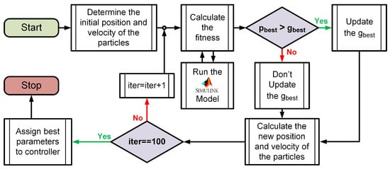 The controller parameters in this study were determined using PSO. It is an optimization algorithm discovered by Kennedy and Eberhart (1995) and created by taking advantage of the swarm behaviour, as in many optimization techniques []. All particles in the swarm try to move their position closer to the best position within the swarm, this process continues until the best position is reached [,]. All particles in the PSO algorithm are updated in each iteration with the best solution of the current iteration () and the best solution of all iterations () []. Expressions in which new particle velocities are determined are given in Equation (22), and new particle positions are given in Equation (23). Here, and are respectively the current and next positions of the particles, and are respectively the current and next speeds of the particles, and are the learning coefficients, and w is the inertia weight. and values are random numbers in the range , which can optionally be sampled from a uniform distribution. These random values add randomness to the optimization algorithm.