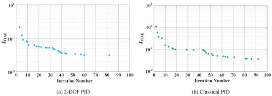 Here, is the optimization cost or performance index, as stated in the literature, t refers to time and represents the error depending on time. Figure 8 illustrates the change in values during the optimization process used to determine the parameters of the controllers.
