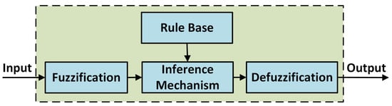 In classical control systems, system’s mathematical model is created and controller used is built based on this model. In the fuzzy logic controller, the experience and control strategy of an expert opinion on the system are used as a database. While designing a fuzzy logic controller, in order to get the best efficiency from the controller, the expert who creates the control strategy must know the system very well []. The general structure of the fuzzy inference system is given in Figure 9 [].