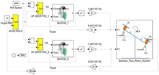 The Simulink model of the BLDCM driven 2R-UAV balance system with an AF 2-DOF PID controller is displayed in Figure 11. In this model, an AF 2-DOF PID controller is used for closed-loop control of both balance angle and BLDCM speeds.