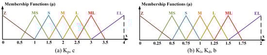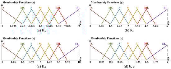 The balance angle and , , , b and c output variables of the BLDCM speed controller are expressed with seven triangular membership functions, as seen in Figure 14 and Figure 15. These membership functions are named with the linguistic labels Z (zero), MS (middle-small), S (small), M (middle), L (large), ML (middle-large), EL (extra-large).