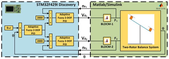 In the literature, UAVs are typically controlled by classical PID and 2-DOF PID controllers, which have been successfully applied in control systems recently [,,]. Additionally, artificial intelligence-based controller structures are also used to control UAVs [,,]. In this study, unlike the control structures commonly used in the literature, an AF 2-DOF PID controller, which is a combination of 2-DOF PID and artificial intelligence and fuzzy logic control methods, was used for the 2R-UAV’s balance control. The outcomes were compared with those of classical PID and 2-DOF PID controllers in order to assess the effectiveness of the AF 2-DOF PID controller. Also, in this study, differing from the studies in the literature, the speeds of the BLDCMs used as the drive elements, as well as the balance angle, were controlled in a closed loop, and the control performance of the balance angle was improved. Under identical settings, the parameters of the classical and 2-DOF PID controllers utilized in the study were determined using the Particle Swarm Optimization (PSO) technique, which has been commonly used to determine controller parameters in current research [,,,]. To examine the real-time performance of the controllers used in the study on a microprocessor, the Co-Simulation structure of the system was created using the STM32F4 microprocessor and MATLAB/Simulink. The performance of classical and 2-DOF PID, and AF 2-DOF PID controllers was comparatively examined using Co-Simulation results.