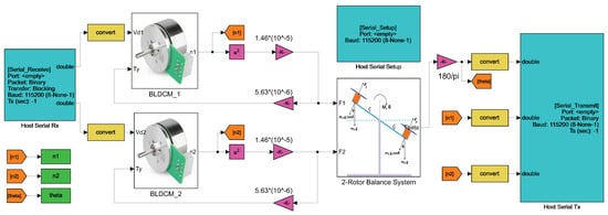 In this study, classical and 2-DOF PID, and AF 2-DOF PID controller structures used to control the system were modeled using the Waijung Library in a Simulink environment. The created model was uploaded to the STM32F429I development board with a Build Model in Simulink. Subsequently, this environment was used to simulate the dynamic complete system, which was constructed utilizing the 2R-UAV balancing system model and the BLDCM and its drive system model. The Simulink model to be utilized in the Simulation, shown in Figure 18, was acquired by adding UART serial communication blocks to this developed model to connect with STM32F429I.