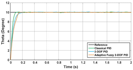 In the Co-Simulation studies, the system was controlled with the classical PID, 2-DOF PID, and AF 2-DOF PID controller. In order to analyse the controller performances, the system was tested with varying loads and reference values. In the first scenario, the reference balance angle is given as 10 degrees. In this case, the balance angle changes for all controllers given in Figure 20. Table 8 gives the performance criteria of the controllers for this scenario. As seen in Figure 20 and Table 8, all of the controllers caught the reference value in a short time and followed the reference steadily. However, although the 2-DOF PID controller achieved the reference earlier, the AF 2-DOF PID controller showed a finer performance than other controllers due to its lower overshoot value and less ripple value in steady state.