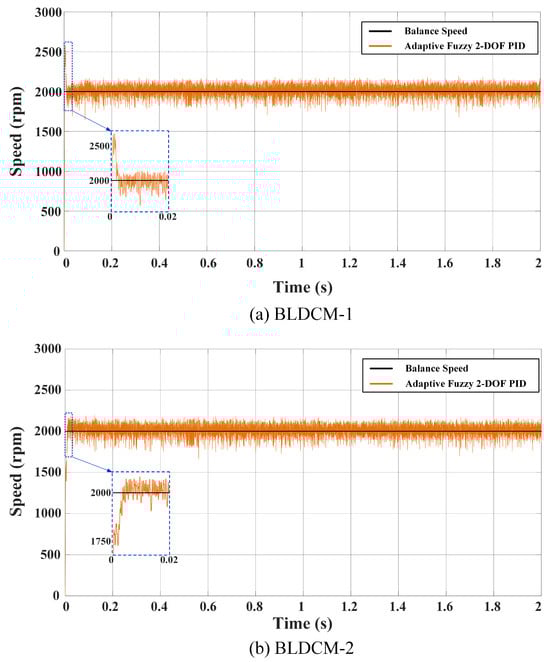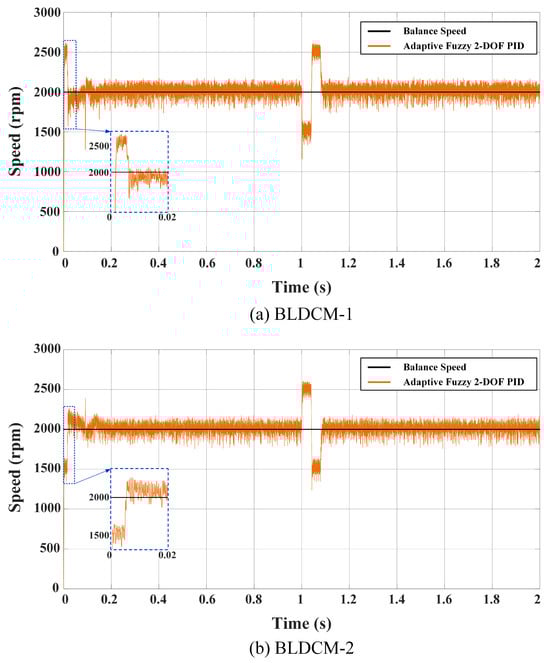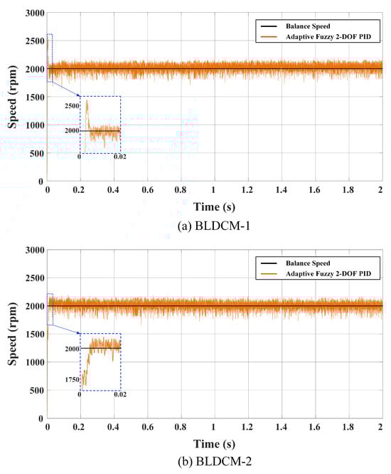 Figure 25 shows both motor speeds for the third scenario with the AF 2-DOF PID controller. When these speed changes are examined, it is seen that there is no significant change in motor speeds when a load is added and both motors operate stably at 2000 rpm balance speed.