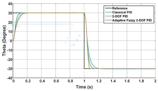 In the second scenario, the reference value of the balance angle is given as 30 degrees for a second and −30 degrees after the first second. In this case, the change of balance angle for all controllers is given in Figure 22. As seen in Figure 22, all of the controllers reached the reference value in a short time and followed the reference steadily. When the controller performance values given in Table 8 and Figure 22 are examined, the 2-DOF PID controller reached the settled reference in a shorter time than the other controllers while the system went to the 30 degree reference balance angle. However, as the reference balance angle goes from 30 degrees to −30 degrees, it is seen that the AF 2-DOF PID controller proposed in this study has a shorter settling time than other controllers with the effect of adaptivity, and its overshoot and steady-state error are less.